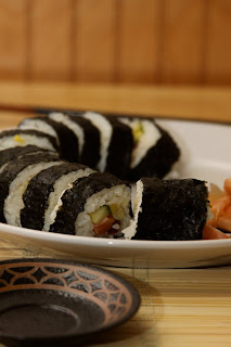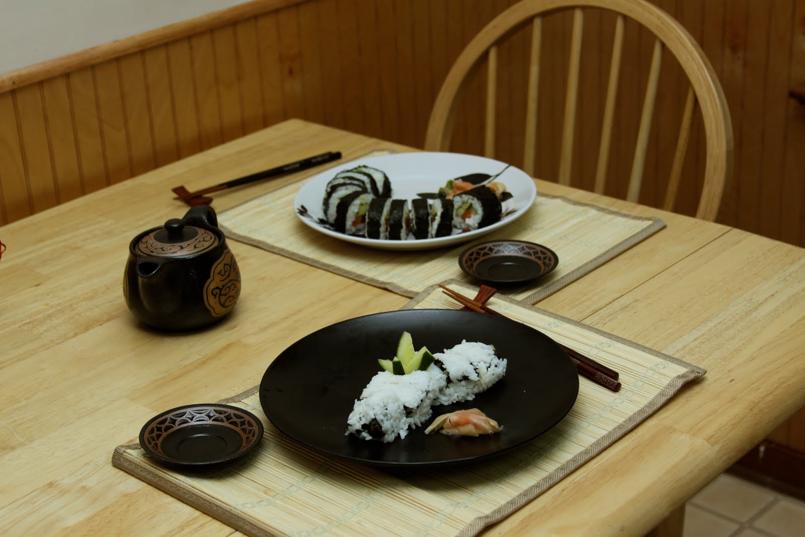 Then made our way over to an Asian grocery store near our house, and Fresh Farm. There we bought Sushi rice, seaweed, lemons, cucumber, wasabi paste, ginger, and mirin (sweetened sake). We already had avocado on hand.