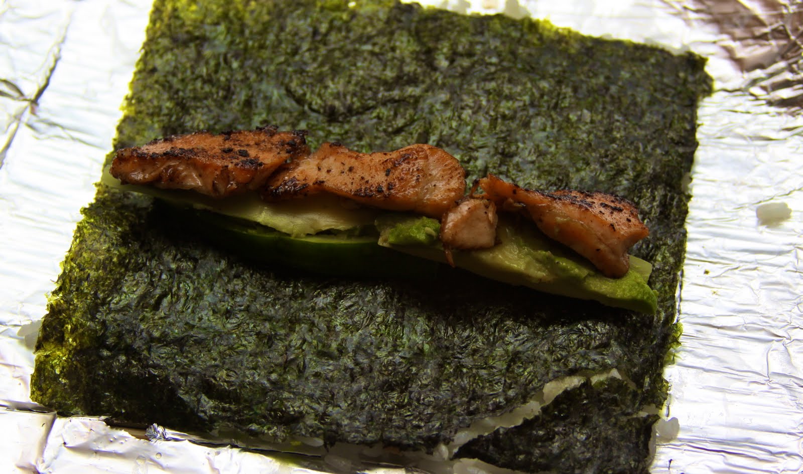 Raw fish does require a little prep. Because fish have parasites, you can't just eat it. Rub either lemon or wasabi over the fish. The acidic of either will kill the parasites. A little trick we learned from the fish market. Sergio also wanted some fish seared on the outside only, so he flash seared some of each. Once the meat is prepped, you'll need to decide if you want the rice on the outside of the roll or the seaweed. I chose rice on the outside and Sergio chose seaweed. When doing rice on the outside, place saran wrap or foil down on your sushi mat. Then a layer of sushi rice, and the seaweed on top of it.