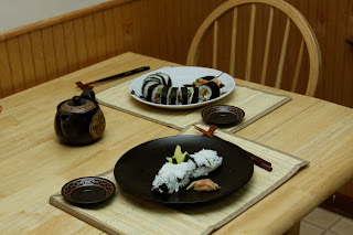 We haven't figured out where to get or how to make some of the special sauces that restaurants use. But a good sweet sauce is mirin. It's mainly used to marinate or in tempura. But we have found a little drizzled on top is yummy. Place some wasabi and ginger on the plate. Pour a little soy sauce, and enjoy.