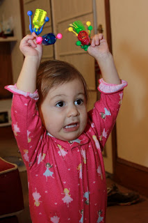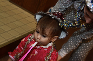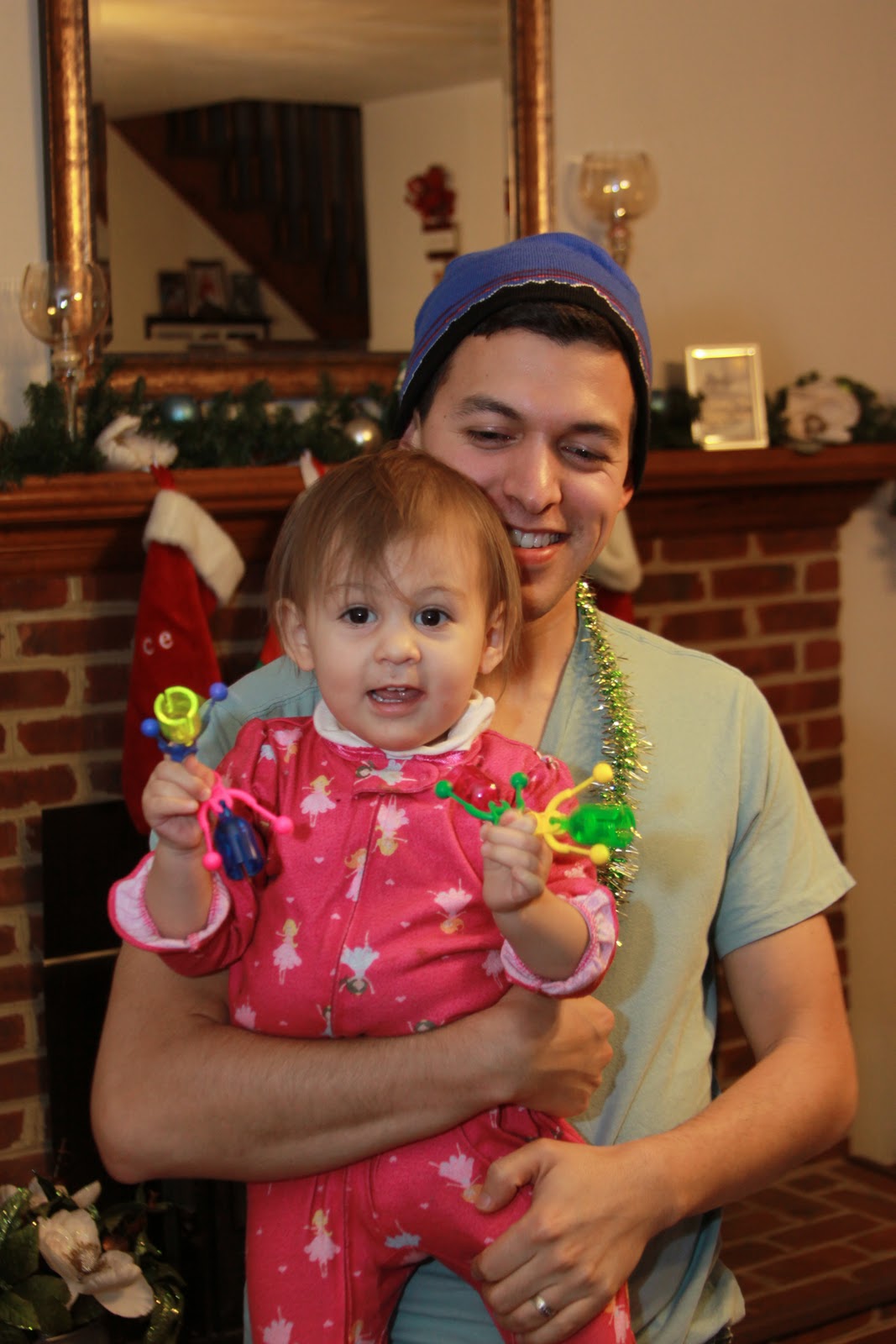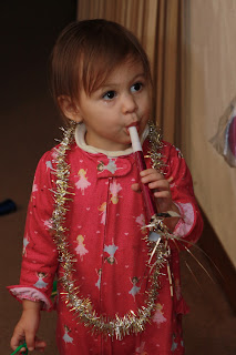 I remembered in our pictures last year, we were all in our pjs, so I decided to make it an official tradition. And of course added some festivity to them with party hats, leis, and various noise makers. Hannah had a blast with all the favors.